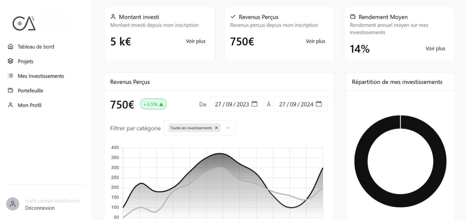 Profitez d’un parcours d’investissement fluide, entièrement automatisé et sécurisé. Accédez à toute votre documentation légale, ainsi qu’à des analyses détaillées pour chaque projet, directement depuis votre espace personnel. Visualisez vos rendements et suivez l’évolution de vos investissements en temps réel grâce à un tableau de bord clair et intuitif.
